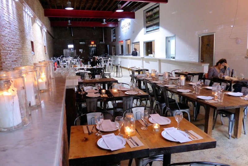 Brick-&-mortar spinoff of eco-friendly food trucks showcasing organic pizzas in a hip, lofty space.